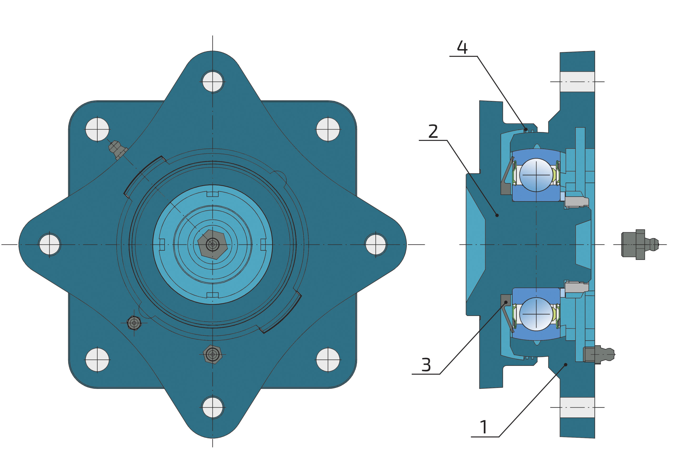 - Корпус подшипника (позиция 1, смотри рисунок), фиксируемый на рамку катка. Сферическая посадка под подшипник и система подачи смазки позволяют подшипнику занимать положение в корпусе не только при статической несоосности, но и при динамической, а также проворачиваться в корпусе в случае блокировки подшипника.